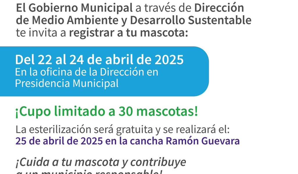 El cupo es limitado a 30 mascotas, por lo que se exhorta a la población interesada a acudir con prontitud a realizar su registro, buscando asegurar la atención para las mascotas.