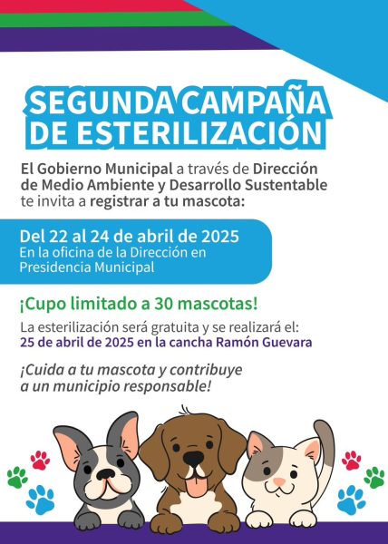 23 Abril 2025; Cuatro Ciénegas, Coahuila.- Como parte del compromiso con el bienestar animal, el Gobierno Municipal de Cuatro Ciénegas, encabezado por el Ing. Víctor Manuel Leija Vega, invita a la ciudadanía a participar en la segunda campaña de esterilización de mascotas, como parte de las acciones en favor de la responsabilidad y cuidado.
