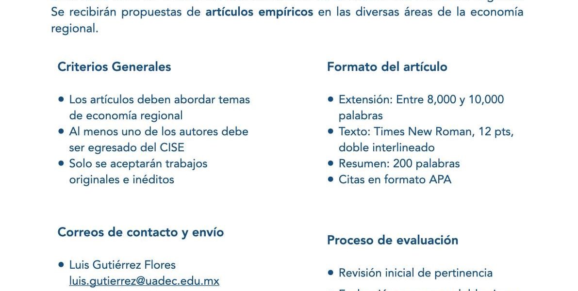 Se recibirán propuestas de artículos en las diversas áreas de la economía regional, al menos uno de los autores debe ser egresado del CISE, solo se aceptarán trabajos originales e inéditos que no estén en evaluación para su publicación en otro medio y se debe adjuntar una carta firmada por los autores donde declaren lo anterior.