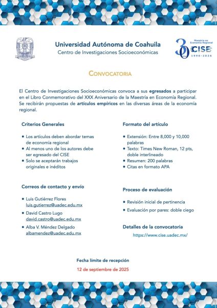 8 Mayo 2025; Saltillo, Coahuila.- La Universidad Autónoma de Coahuila a través del Centro de Investigaciones Socioeconómicas (CISE), convoca a sus egresados a participar en el Libro Conmemorativo del XXX Aniversario de la Maestría en Economía Regional.