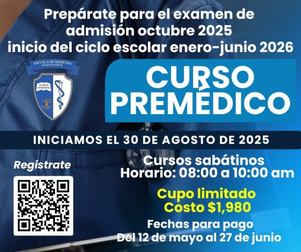 El curso está diseñado especialmente para quienes desean ingresar a la carrera de Medicina, lo que ayudará a los aspirantes a enfrentar con éxito el examen de admisión; el cupo es limitado y el costo es de $1,980 pesos, el pago deberá de realizarse directamente en las oficinas administrativas de la Escuela de Medicina Unidad Norte en un horario de 9:00 a 15:00 horas, la fecha límite es el 27 de junio de 2025.