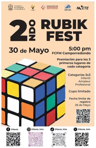 23 Mayo 2025; Saltillo, Coahuila.- La Universidad Autónoma de Coahuila a través del Centro de Investigación en Matemáticas Aplicadas (CIMA) y las Facultades de Ciencias Físico Matemáticas y de Sistemas, invita a la comunidad universitaria y público en general a participar en el Segundo Rubik Fest, que se llevará a cabo el 30 de mayo de 2025 a las 17:00 horas.