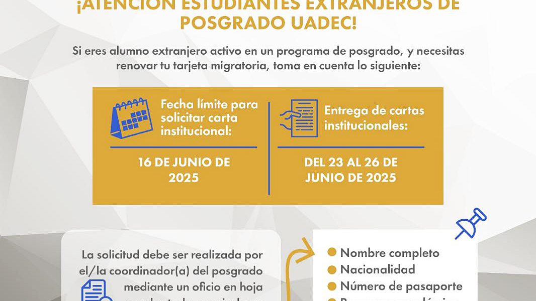 El Oficio deberá enviarse al correo mrodarte@uadec.edu.mx, con copia a relaciones.internacionales@uadec.edu.mx, indicando en el asunto del correo “Renovación Extranjero INM”; la fecha límite para la solicitud de dicho documento es el 16 de junio de 2025, mientras que la entrega de las cartas se realizará del 23 al 26 de junio.