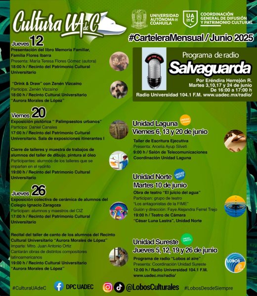 3 Junio 2025; Saltillo, Coahuila.- La Universidad Autónoma de Coahuila a través de la Coordinación General de Difusión y Patrimonio Cultural (DPC), invita a la comunidad universitaria de las Unidades Sureste, Norte y Laguna, y al público en general a disfrutar de las actividades culturales programadas durante el mes de junio 2025.