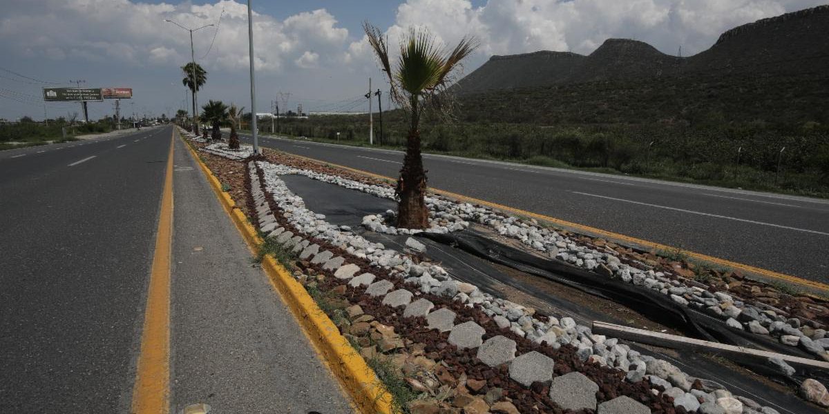 Personal del programa Aquí Andamos, trabaja en el rediseño con piedras de distintas texturas y colores naturales en el camellón central de esta vialidad que comunica a la capital de Coahuila con la autopista que va hacia la ciudad de Torreón.