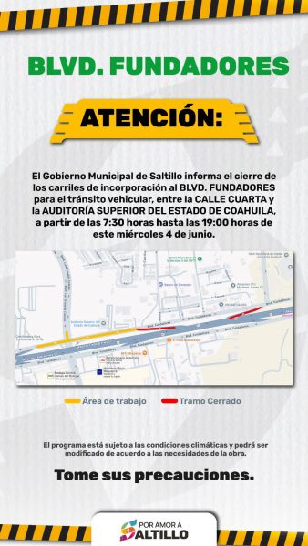 4 Junio 2025; Saltillo, Coahuila.- El Gobierno Municipal de Saltillo dio a conocer el cierre temporal para el tránsito vehicular en los carriles de incorporación al bulevar Fundadores, en el tramo que va desde la calle Cuarta y hasta el edificio de la Auditoria Superior del Estado de Coahuila, en sentido oriente-poniente.
