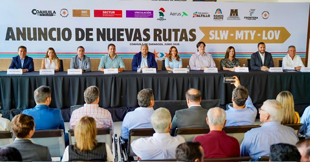 12 Junio 2025; Ramos Arizpe, Coahuila. – Ramos Arizpe se fortalece como el principal polo industrial de Coahuila y en este marco, los Gobiernos Estatal, Municipal y los municipios de Saltillo, Monclova y Frontera junto con la empresa Aerus, anunciaron la apertura de una nueva ruta aérea directa hacia Monterrey, operada por la aerolínea en mención, con vuelos diarios a partir del lunes 16 de junio.