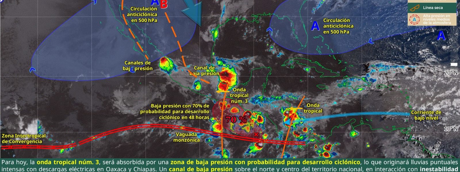 * Chubascos y lluvias fuertes (de 25 a 50 mm) en las cinco regiones del estado, con descargas eléctricas, rachas de viento y posible caída de granizo. Estas lluvias podrían aumentar el nivel de ríos y arroyos, así como provocar encharcamientos, deslaves o inundaciones en zonas bajas.