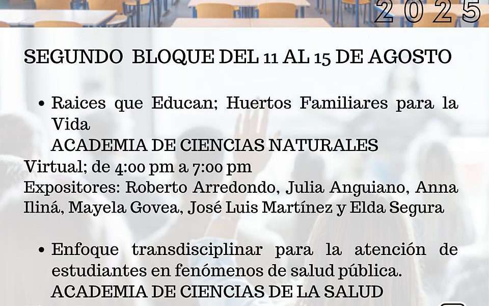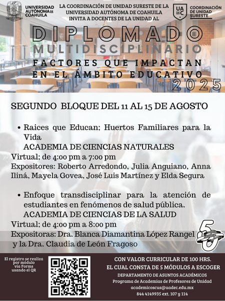3 Julio 2025; Saltillo, Coahuila.- La Universidad Autónoma de Coahuila, a través de la Coordinación de Unidad Sureste y su Departamento de Asuntos Académicos, invita a docentes de US a tomar los Cursos “Raíces que educan: huertos familiares para la vida” y “Enfoque transdisciplinar para la atención de estudiantes en fenómenos de salud pública”, que se llevarán a cabo del 11 al 15 de agosto de 2025 a través de la plataforma Microsoft Teams.