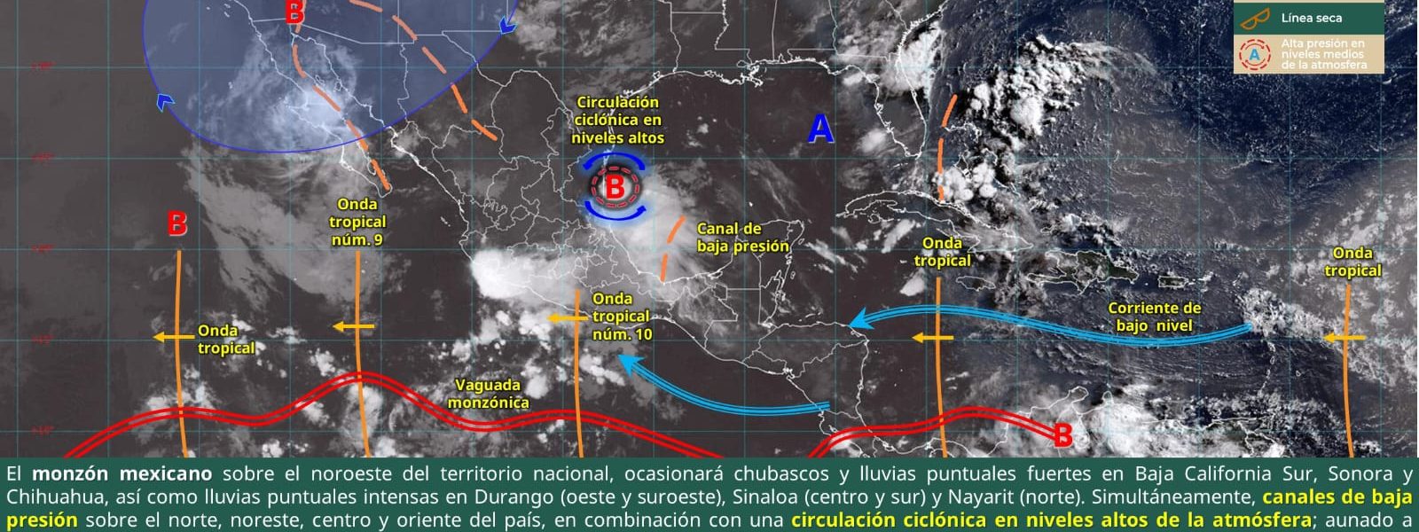 9 Julio 2025; Saltillo, Coahuila. – La Secretaría de Gobierno, a través de la Subsecretaría de Protección Civil del Estado, informa que canales de baja presión sobre el norte, noreste, centro y oriente del país, en combinación con una circulación ciclónica en niveles altos de la atmósfera; aunado a inestabilidad atmosférica y el desplazamiento de la onda tropical núm. 10 sobre el sur y occidente de México, propiciarán chubascos y lluvias fuertes a puntuales muy fuertes en Coahuila.