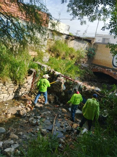 De manera paralela, brigadas de “Aquí Andamos” reforzaron los trabajos de limpieza, retiro de basura y escombro en el cauce del arroyo Ceballos, a la altura del bulevar José María Rodríguez, en la colonia Alpes Norte
