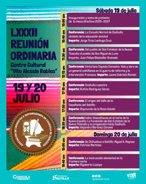 15 Julio 2025; Saltillo, Coahuila.- Con motivo del 448 aniversario de la fundación de Saltillo, la Asociación de Cronistas e Historiadores de Coahuila de Zaragoza, A.C., llevará a cabo su LXXXII Reunión Ordinaria los días 19 y 20 de julio de 2025 en el Centro Cultural “Vito Alessio Robles”, con el respaldo del Gobierno del Estado de Coahuila, el Ayuntamiento de Saltillo y la Secretaría de Cultura.