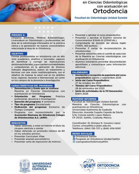 21 Julio 2025; Saltillo, Coahuila.- La Universidad Autónoma de Coahuila a través de la Facultad de Odontología Unidad Sureste, convoca a Médicos Estomatólogos, Licenciados en Odontología y profesionistas del área de la odontología, a interesados en la práctica clínica y la generación de nuevos conocimientos sobre la ortodoncia, a estudiar la Maestría en Ciencias Odontológicas con actuación en Ortodoncia.