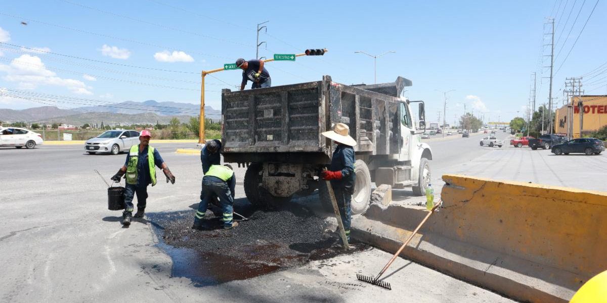 Asimismo, personal de la Dirección de Infraestructura y Obra Pública lleva a cabo acciones de reparación de la carpeta asfáltica de la entrada del fraccionamiento Las Teresitas, esto en el cruce del bulevar Antonio Cárdenas y Avenida Las Teresitas.
