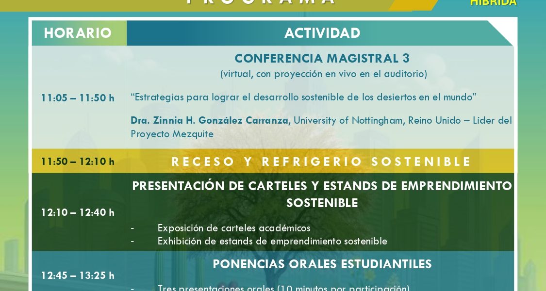 De 11:05 a 11:50 «Estrategias para lograr el desarrollo sostenible de los desiertos en el mundo», por la Dra. Zinnia H. González Carranza de University of Nottingham, Reino Unido y Líder del Proyecto Mezquite; de 11:50 a 11:10 horas receso y un refrigerio sostenible.