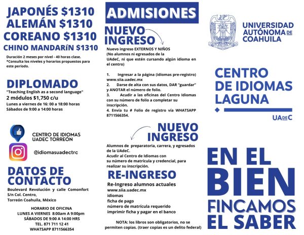 El Centro de Idiomas se encuentra ubicado en bulevar Revolución y calle Comonfort s/n, en la colonia Centro de Torreón, el horario de atención es de lunes a viernes de 8:00 a 21:00 horas y sábados de 9:00 a 14:00 horas, para más información, se pueden comunicar al 871 711 12 41 o visitar la cuenta en Instagram: @idiomasuadectrc.