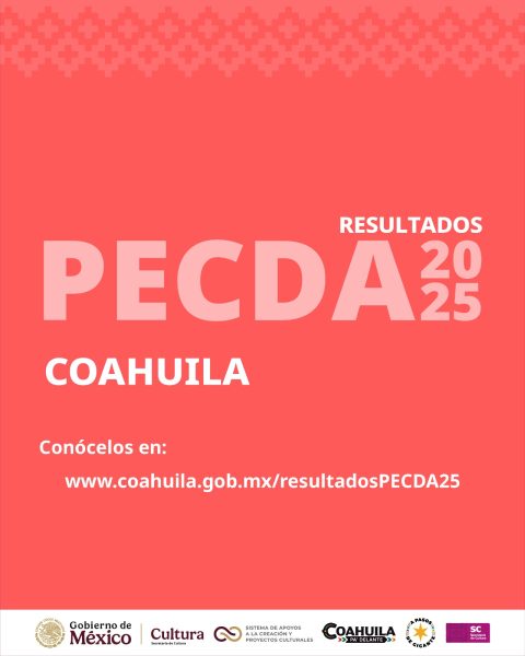 20 Agosto 2025; Saltillo, Coahuila de Zaragoza.- El Gobierno del Estado de Coahuila de Zaragoza, a través de la Secretaría de Cultura de Coahuila, en colaboración con la Secretaría de Cultura del Gobierno de México, a través del Sistema de Apoyos a la Creación y Proyectos Culturales (SACPC), dan a conocer los resultados de la convocatoria PECDA2025.