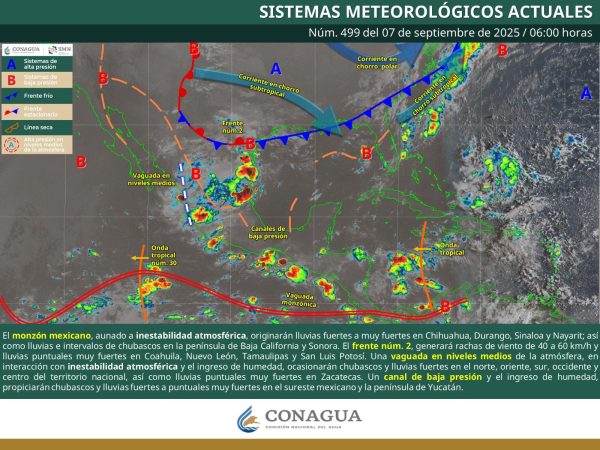 8 Septiembre 2025; Saltillo, Coahuila de Zaragoza. – La Secretaría de Gobierno, a través de la Subsecretaría de Protección Civil del Estado, informa que el frente frío número 2 se extenderá con características de estacionario sobre el noreste del territorio nacional, ocasionando rachas de viento de 40 a 60 km/h y lluvias puntuales muy fuertes, acompañadas de descargas eléctricas y posible caída de granizo en Coahuila.