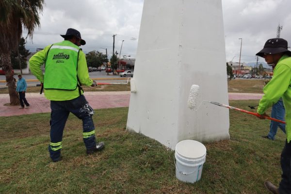 En coordinación, brigadas de las diversas Direcciones Municipales trabajaron en la rehabilitación de los siete pilares de concreto de la monumental escultura del Sarape de Saltillo, con la aplicación de pintura y eliminación de grafiti.