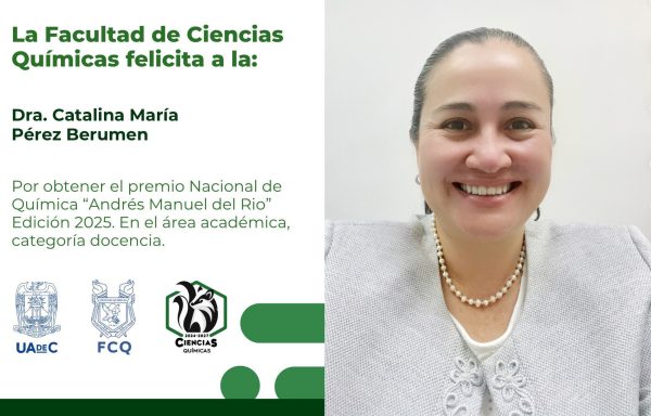 3 Octubre 2025; Saltillo, Coahuila.- Catalina María Pérez Berumen, profesora e investigadora de la Facultad de Ciencias Químicas de la Universidad Autónoma de Coahuila, recibirá el Premio Nacional de Química “Andrés Manuel del Río” 2025 en la categoría Docencia, lo que la convierte en el primer docente de la institución en hacerse acreedor a este galardón.
