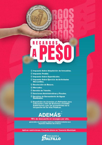 A finales del mes de septiembre el Cabildo de Saltillo, aprobó por unanimidad el otorgamiento de diferentes estímulos fiscales entre los que se encuentran el cobro de 1 peso por concepto de recargos por año, generados por el impuesto Predial.
