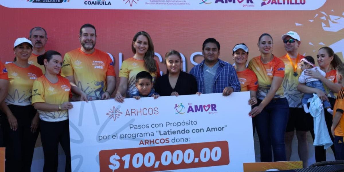13 Octubre 2025; Saltillo, Coahuila.- La carrera ARHCOS 2025 “Pasos con Propósito” se llevó a cabo con éxito logrando recaudar un donativo de 100 mil pesos que fueron entregados al DIF Saltillo para impulsar el programa “Latiendo con Amor”.