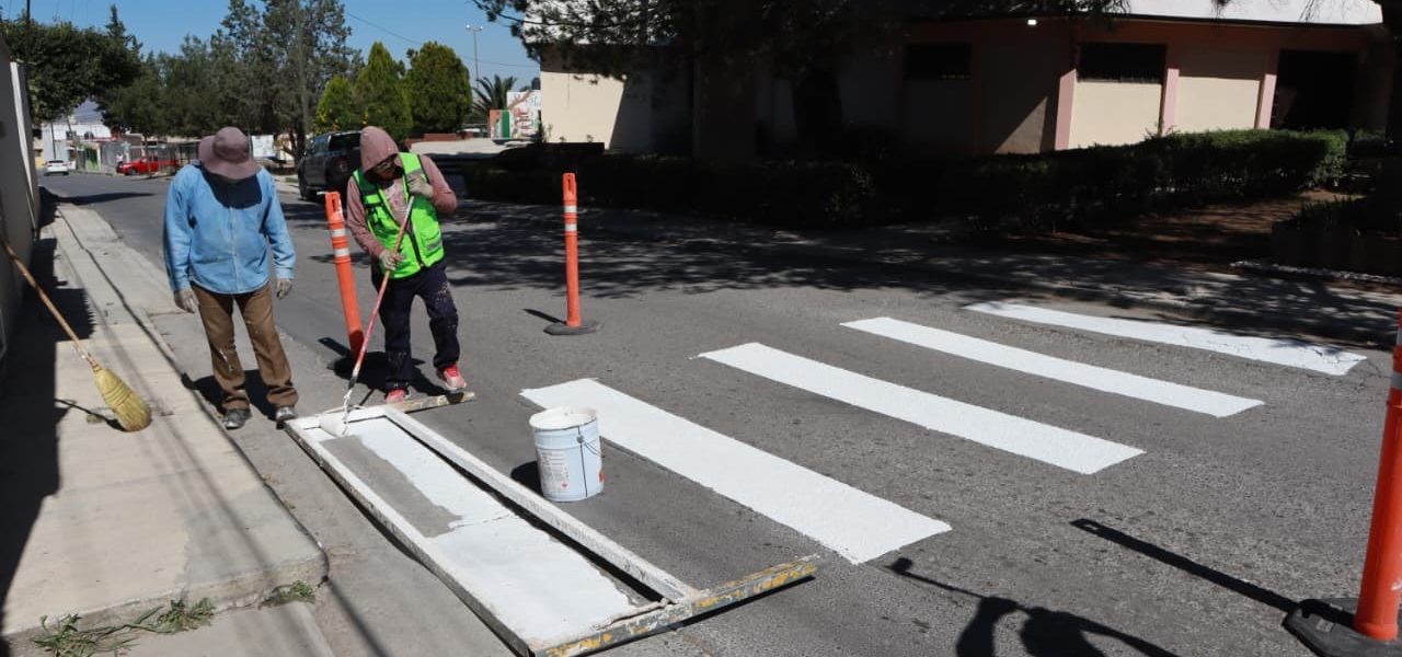 A través del programa “Colonias al 100”, implementado por el alcalde Javier Díaz González y el apoyo del Gobierno del Estado, personal del Instituto Municipal de Movilidad Urbana Sostenible, IMMUS, trabajó en la delimitación del paso peatonal en la colonia Lomas de Lourdes.