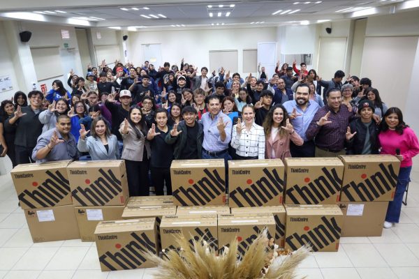 A nombre de la comunidad estudiantil de FEM, Diego Betrado y Carlos Adame, aplaudieron la entrega de equipo de cómputo que el Rector realizó para beneficio de ellos y sus compañeros.
