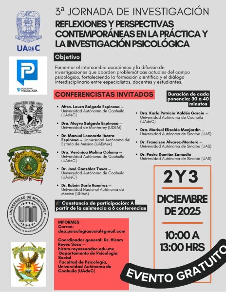 Para más información escribir a los correos electrónicos de dep.psicologiasocial@gmail.com e hiram.reyes@uadec.edu.mx o llamar al teléfono (844) 412 35 28.