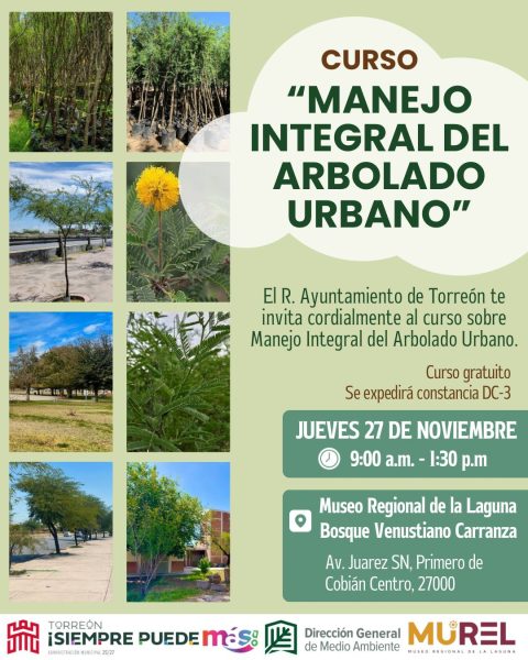 24 Noviembre 2025; Torreón, Coahuila.- La Administración Municipal, a través de la Dirección General de Medio Ambiente, en colaboración con Protección Civil y Bomberos, la Facultad de Ciencias Biológicas de la UJED y la empresa Garden Solutions, llevará a cabo el curso de capacitación sobre “Manejo integral del arbolado urbano” el próximo 27 de noviembre.