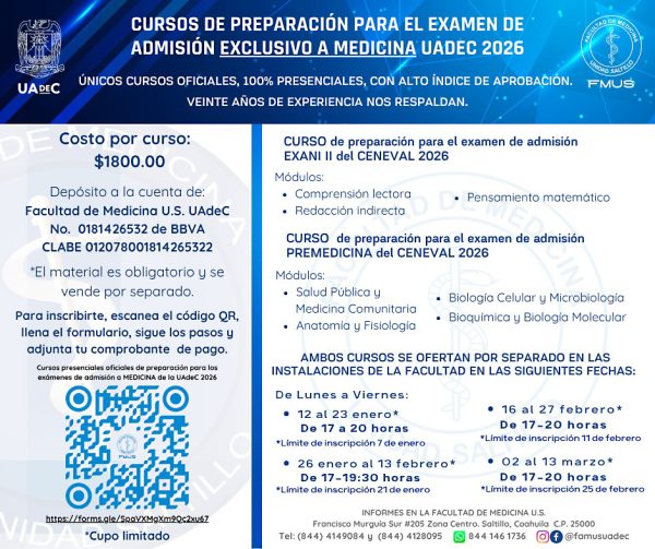26 Noviembre 2025; Saltillo, Coahuila.- La Facultad de Medicina Unidad Sureste de la Universidad Autónoma de Coahuila invita a las y los aspirantes a la Licenciatura en Médico Cirujano a participar en el Curso de Preparación para el Examen de Admisión para el ciclo agosto-diciembre 2026.