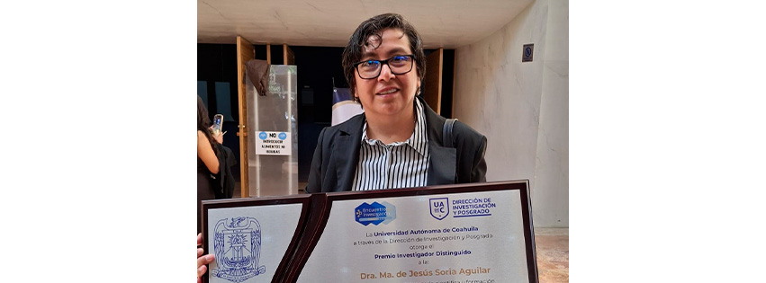 2 Diciembre 2025; Saltillo, Coahuila.- La Dra. Ma. de Jesús Soria Aguilar, profesora de la Facultad de Metalurgia de la Universidad Autónoma de Coahuila, recibió el reconocimiento como “Investigadora Distinguida” en el Encuentro de Investigación 2025 y los Premios de Investigación y Estudios Avanzados UAdeC, esto por su destacada labor en el ámbito científico.