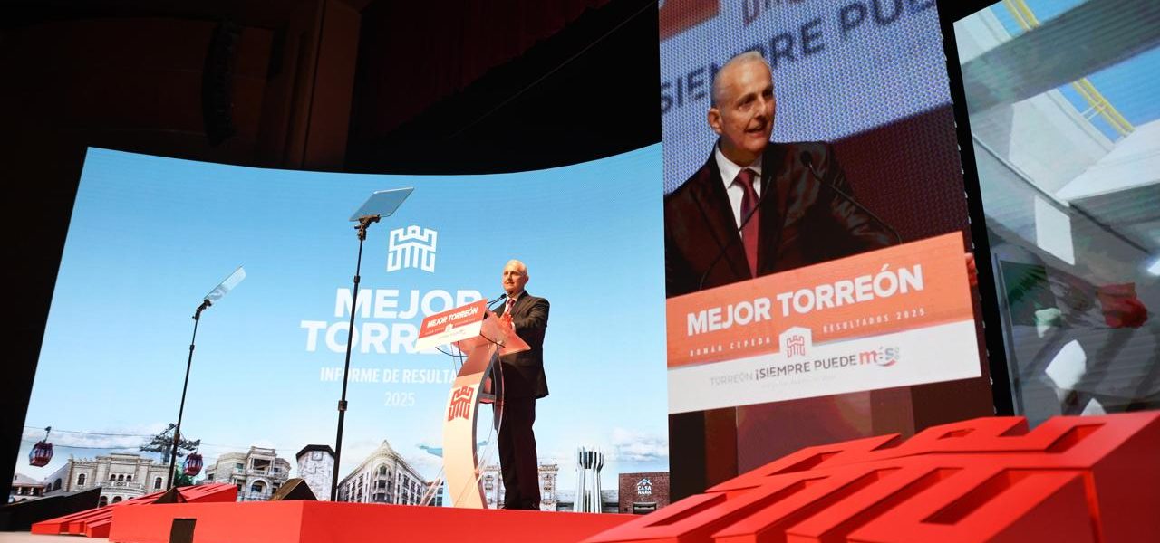 5 Diciembre 2025; Torreón, Coahuila.- El alcalde Román Alberto Cepeda González entregó durante la Tercera Sesión Solemne de Cabildo, el Primer Informe de Resultados sobre el estado que guarda la actual Administración Pública Municipal, en donde destacó que Torreón está entre las ciudades con más de 500 mil habitantes más seguras del país, así como las acciones en infraestructura, fortalecimiento económico y atención social que se han ejecutado este 2025.