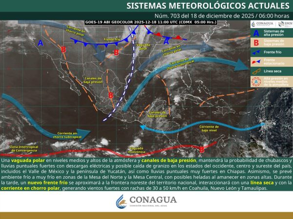 18 Diciembre 2025; Saltillo, Coahuila de Zaragoza.– La Secretaría de Gobierno, a través de la Subsecretaría de Protección Civil del Estado, informa que un nuevo frente frío se aproximará a la frontera noreste del territorio nacional. Este sistema interaccionará con una línea seca y con la corriente en chorro polar, lo que generará vientos fuertes en diversas regiones de Coahuila, con rachas de 30 a 50 km/h.