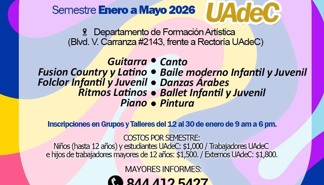 Para más información, comunicarse al Departamento de Formación Artística de Grupos y Talleres de la UAdeC al teléfono (844) 412 54 27.