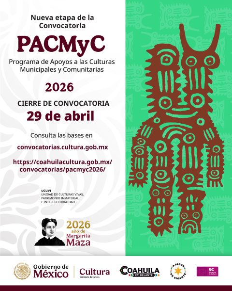 22 Enero 2026; Saltillo, Coahuila de Zaragoza.– La Secretaría de Cultura del Estado de Coahuila informa que ya se encuentra abierta la convocatoria del Programa de Apoyo a las Culturas Municipales y Comunitarias (PACMyC) 2026, impulsada por la Secretaría de Cultura del Gobierno de México, a través de la Unidad de Culturas Vivas, Patrimonio Inmaterial e Interculturalidad (UCUVI. Esta nueva etapa del programa tiene como objetivo fortalecer, desarrollar y salvaguardar la diversidad cultural de los pueblos indígenas, afromexicanos y comunidades populares del país, incluidas las del estado de Coahuila.