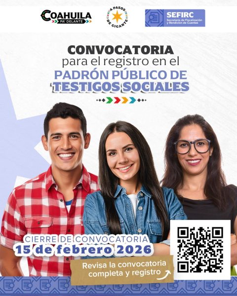 22 Enero 2026; Saltillo, Coahuila de Zaragoza.- Al enfatizar la importancia de la participación ciudadana en la vigilancia del uso de los recursos públicos, la Secretaría de Fiscalización y Rendición de Cuentas (SEFIRC) reiteró la invitación para postularse en el Padrón Público de Testigos Sociales de las contrataciones del Gobierno del Estado de Coahuila.