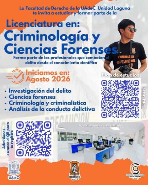 29 Enero 2026; Torreón, Coahuila.-La Universidad Autónoma de Coahuila, a través de la Facultad de Derecho Unidad Laguna, invita a aspirantes interesados en el ámbito de la procuración e impartición de justicia a formar parte del proceso de admisión de agosto-diciembre 2026 e ingresar a la Licenciatura en Criminología y Ciencias Forenses.