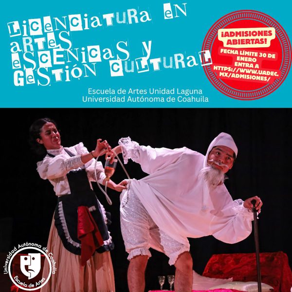 30 Enero 2026; Torreón, Coahuila.- La Escuela de Artes Escénicas de la Universidad Autónoma de Coahuila (UAdeC) en la Unidad Laguna, invita a los jóvenes con inquietudes artísticas y compromiso social, a formar parte de la licenciatura en Artes Escénicas y Gestión Cultural y registrarse este 30 de enero.