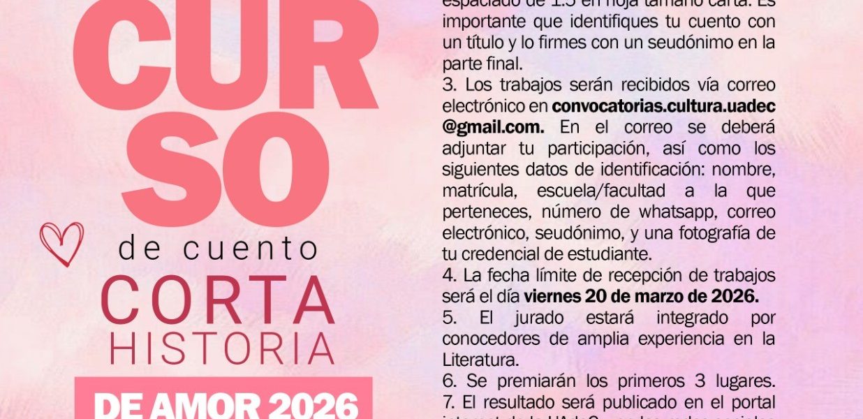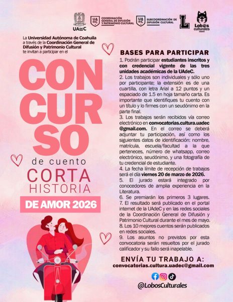 6 Febrero 2026; Saltillo, Coahuila.- La Universidad Autónoma de Coahuila a través de la Coordinación General de Difusión y Patrimonio Cultural, invita a sus estudiantes inscritos y con credencial vigente de las tres unidades académicas a participar en el Concurso de Cuento “Corta Historia de Amor 2026”.