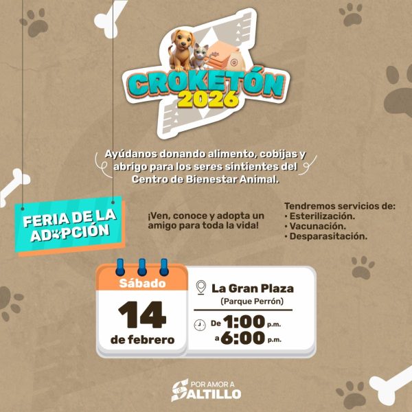 11 Febrero 2026; Saltillo, Coahuila.- El Gobierno Municipal de Saltillo invitó a la ciudadanía a sumarse este sábado 14 de febrero al Croquetón 2026 y apoyar donando alimento, cobijas o abrigo para los seres sintientes que más lo necesitan.
