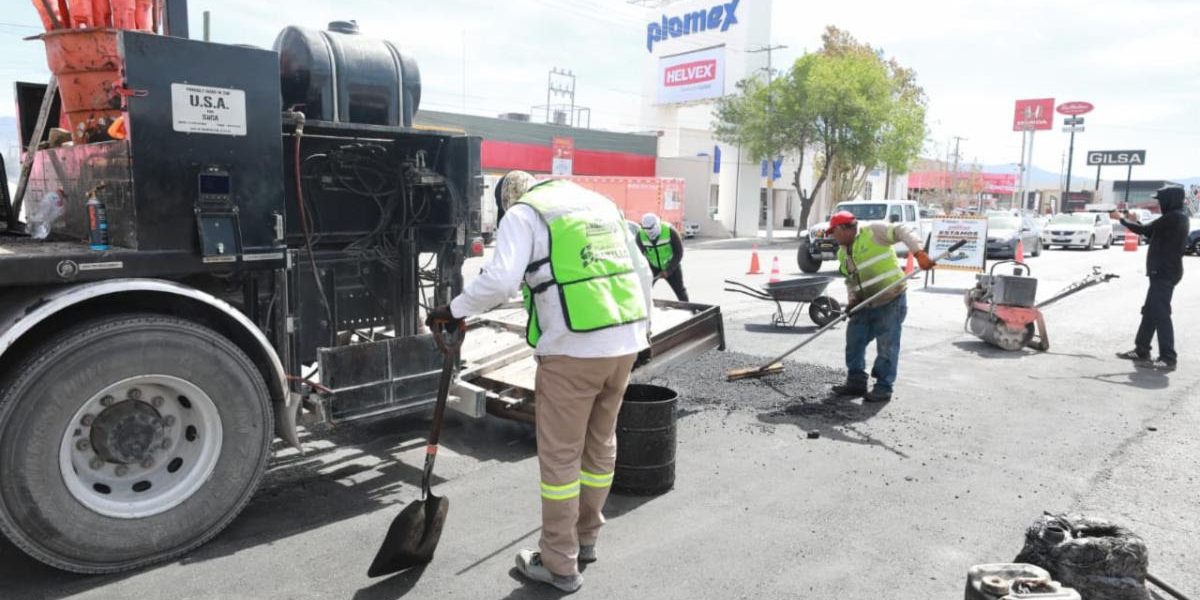 De manera simultánea, personal de la Dirección de Infraestructura y Obra Pública continúa sus labores de reparación sobre la avenida María del Socorro F. de C., entre el bulevar Isidro López Zertuche y la calle 18, del fraccionamiento Las Brisas, al norte de Saltillo.