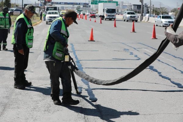 Además, como parte del mantenimiento preventivo para evitar fisuras y mayores daños en el asfalto, cuadrillas de Saltillo llevan a cabo el sellado de grietas en distintos tramos del pavimento del bulevar Venustiano Carranza.