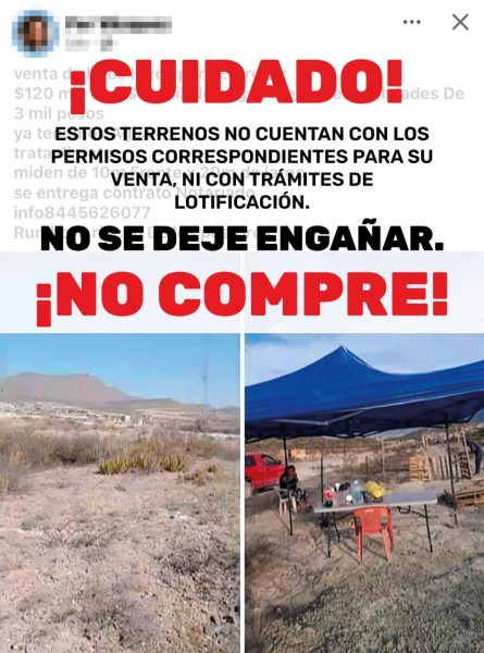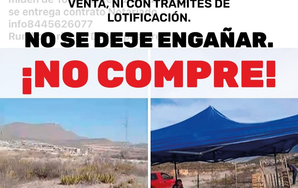 6 Marzo 2026; Saltillo, Coahuila.- El Gobierno Municipal de Saltillo alertó a la ciudadanía sobre la oferta de terrenos que se promueven a través de redes sociales rumbo a Rincón de los Pastores.