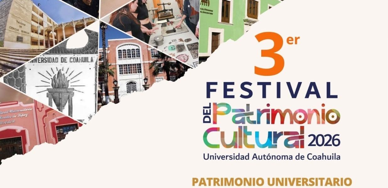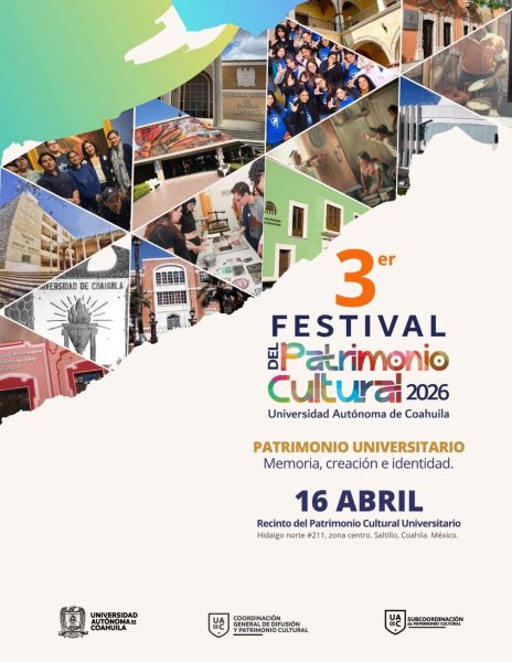 13 Abril 2026; Saltillo, Coahuila.- La Universidad Autónoma de Coahuila a través de la Coordinación General de Difusión y Patrimonio Cultural, invita a la comunidad universitaria y público en general al Tercer Festival del Patrimonio Cultural 2026, que se llevará a cabo el próximo jueves 16 de abril.