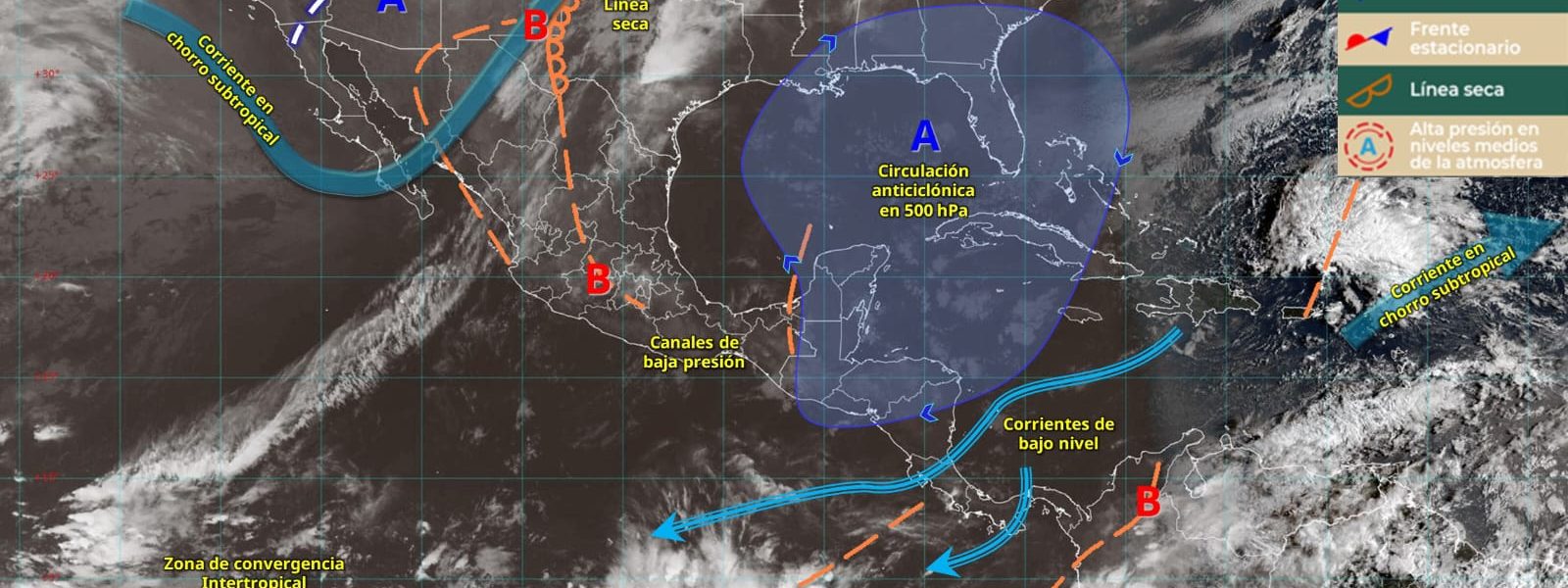 De acuerdo con el pronóstico del Servicio Meteorológico Nacional, se esperan intervalos de chubascos (de 5 a 25 mm) en la región norte del estado, acompañados de descargas eléctricas, posible caída de granizo, así como rachas de viento de 50 a 70 km/h, con probabilidad de formación de torbellinos, principalmente en esa zona.