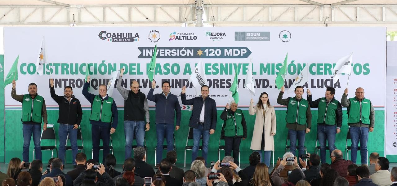 21 Abril 2026; Saltillo, Coahuila de Zaragoza.- Como parte de las múltiples obras de infraestructura que se están realizando a lo largo y ancho del estado y en las que se invierten miles de millones de pesos, el gobernador Manolo Jiménez Salinas y el alcalde Javier Díaz González pusieron en marcha los trabajos de construcción del paso a desnivel en la colonia Misión Cerritos, en el cual se invertirán más de 120 millones de pesos y que vendrá a solucionar un añejo problema vial en esta zona de la capital del estado.