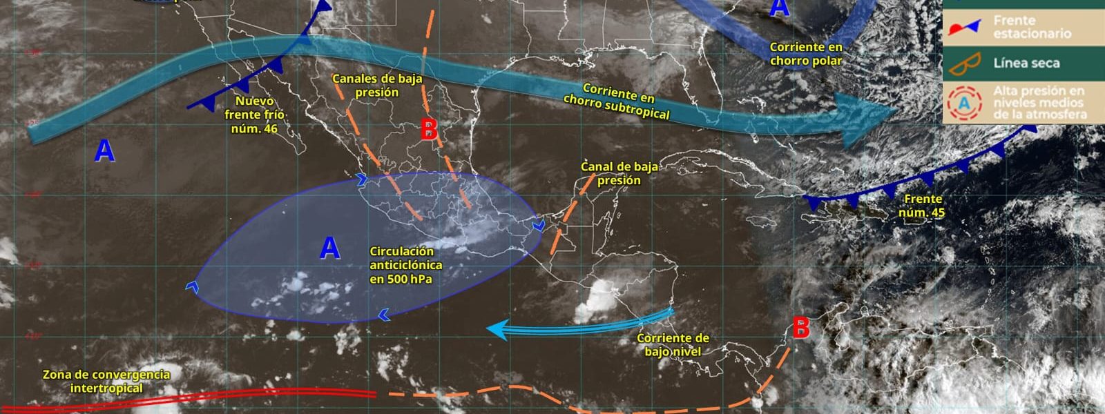 De acuerdo con el pronóstico del Servicio Meteorológico Nacional, se esperan intervalos de chubascos de 5 a 25 mm, principalmente en la región Sureste, acompañados de descargas eléctricas. Asimismo, se prevé viento de componente norte de 20 a 30 km/h, con rachas de 40 a 60 km/h en diversas zonas del estado.