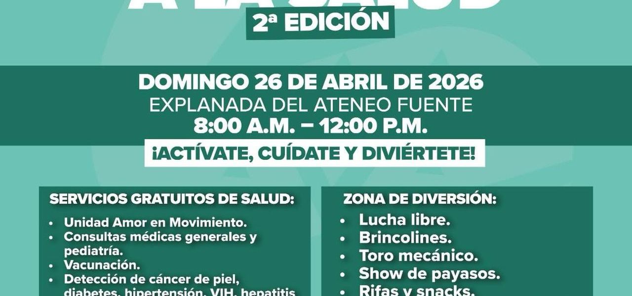 Roberto Cárdenas Zavala, director de Salud Pública Municipal, informó que esta segunda edición se realizará en la explanada del Ateneo Fuente, dentro de la Ruta Recreativa, en horario de 8:00 de la mañana a 12:00 del mediodía.