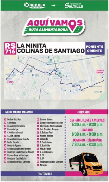 27 Abril 2026; Saltillo, Coahuila.- El alcalde de Saltillo, Javier Díaz González, informó que a partir del 6 de mayo arrancará la nueva ruta alimentadora RS-716 que recorrerá, de la colonia Colinas de Santiago a La Minita, y viceversa.